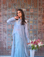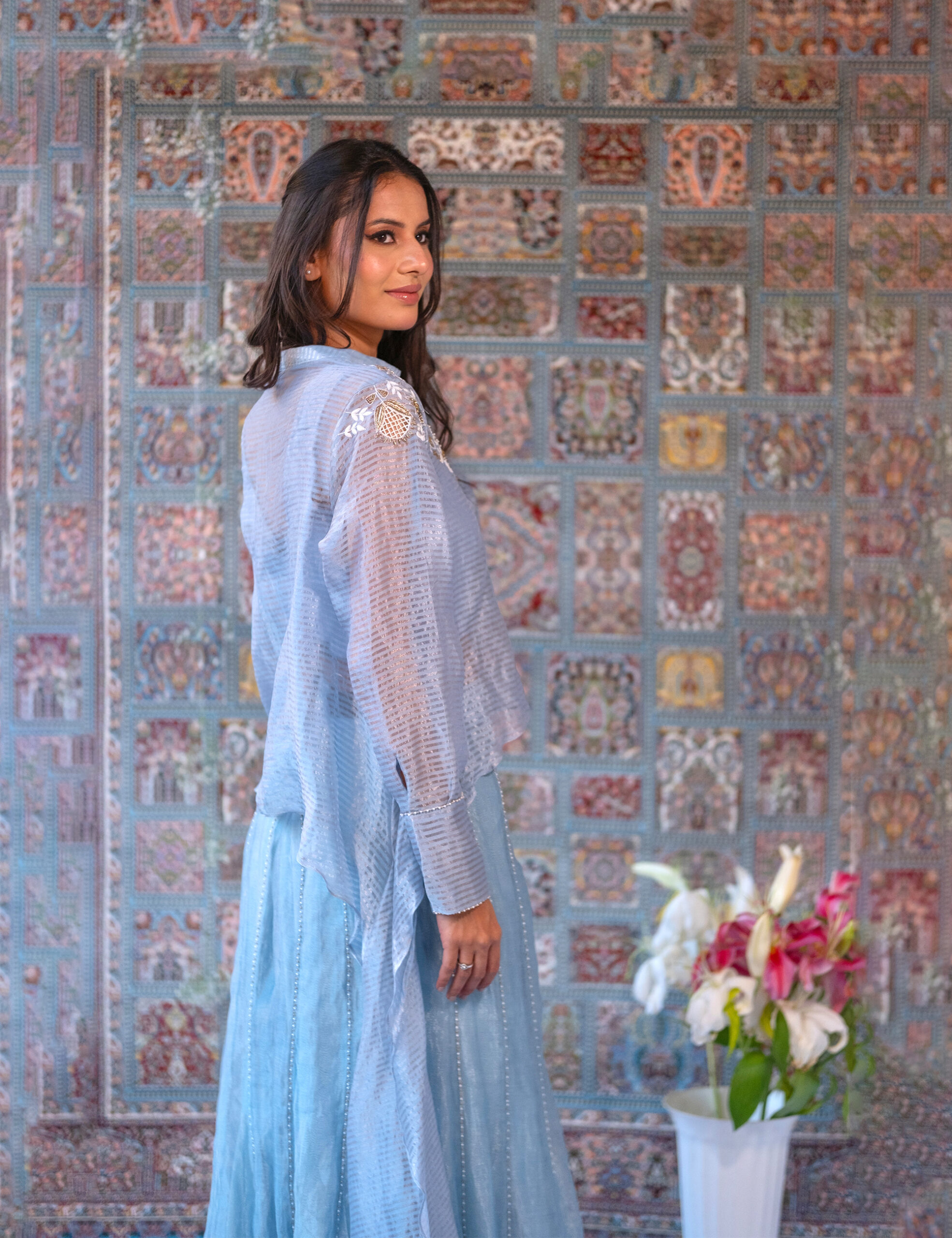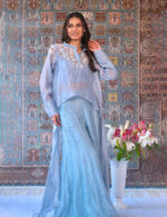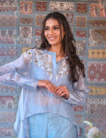 This Blue Chanderi co-ord set embroidered with delicate yet intricate patterns make it dreamy. Paired with panneled embroidered pants and a crop top.