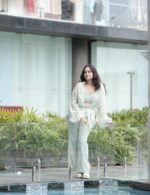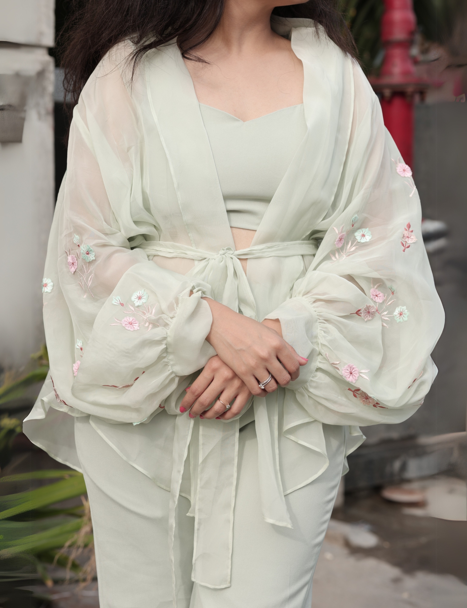 This delicate and stunning floral embroidered mint jacket is perfect for spring days. The intricate flower thread embroidery gives a summer overtone. The set includes a jacket , crop-top, flared pants along with a belt.