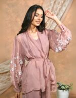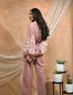 This delicate and stunning floral embroidered nude jacket is perfect for spring days. The intricate flower thread embroidery gives a summer overtone. The set includes a jacket , crop-top, flared pants along with a belt.
