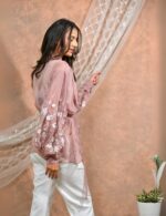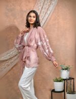 This delicate and stunning floral embroidered nude jacket is perfect for spring days. The intricate flower thread embroidery gives a summer overtone. The set includes a jacket , crop-top, flared pants along with a belt.