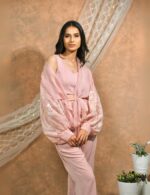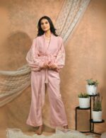 This delicate and stunning floral embroidered Peach jacket is perfect for spring days. The intricate flower thread embroidery gives a summer overtone. The set includes a jacket , crop-top, flared pants along with a belt.