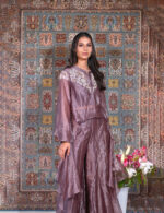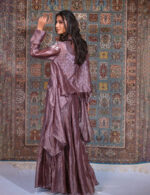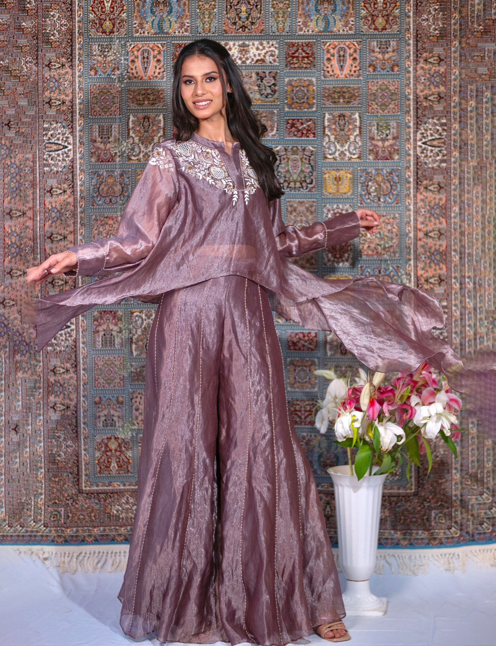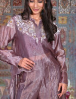 This Lavender Chanderi co-ord set embroidered with delicate yet intricate patterns make it dreamy. Paired with panneled embroidered pants and a crop top.
