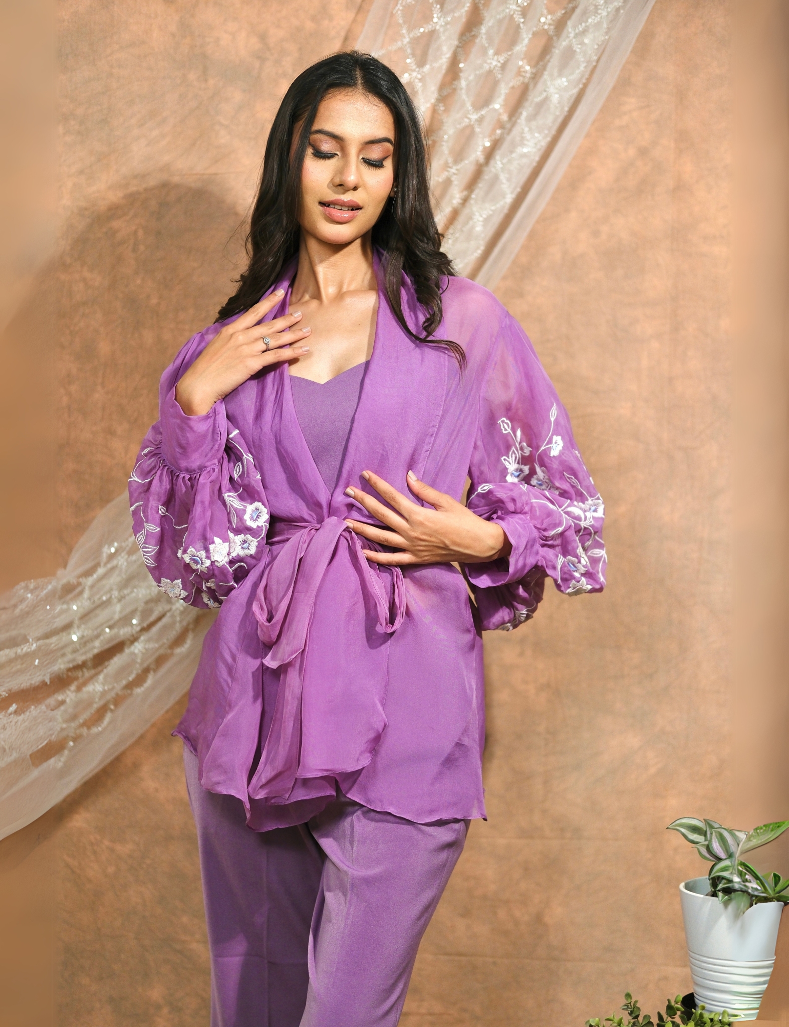 Lavender embroidered jacket with floral detailing.
