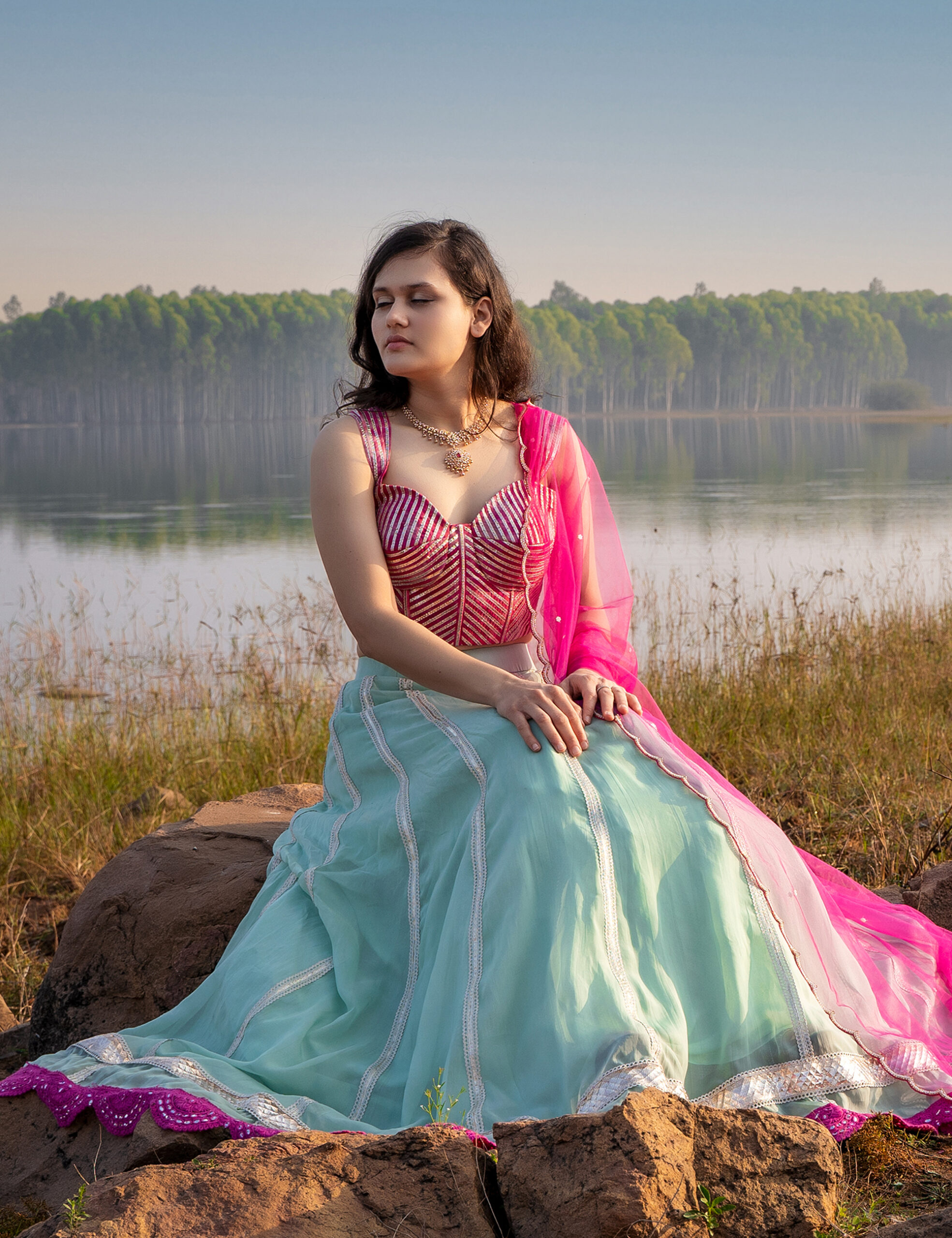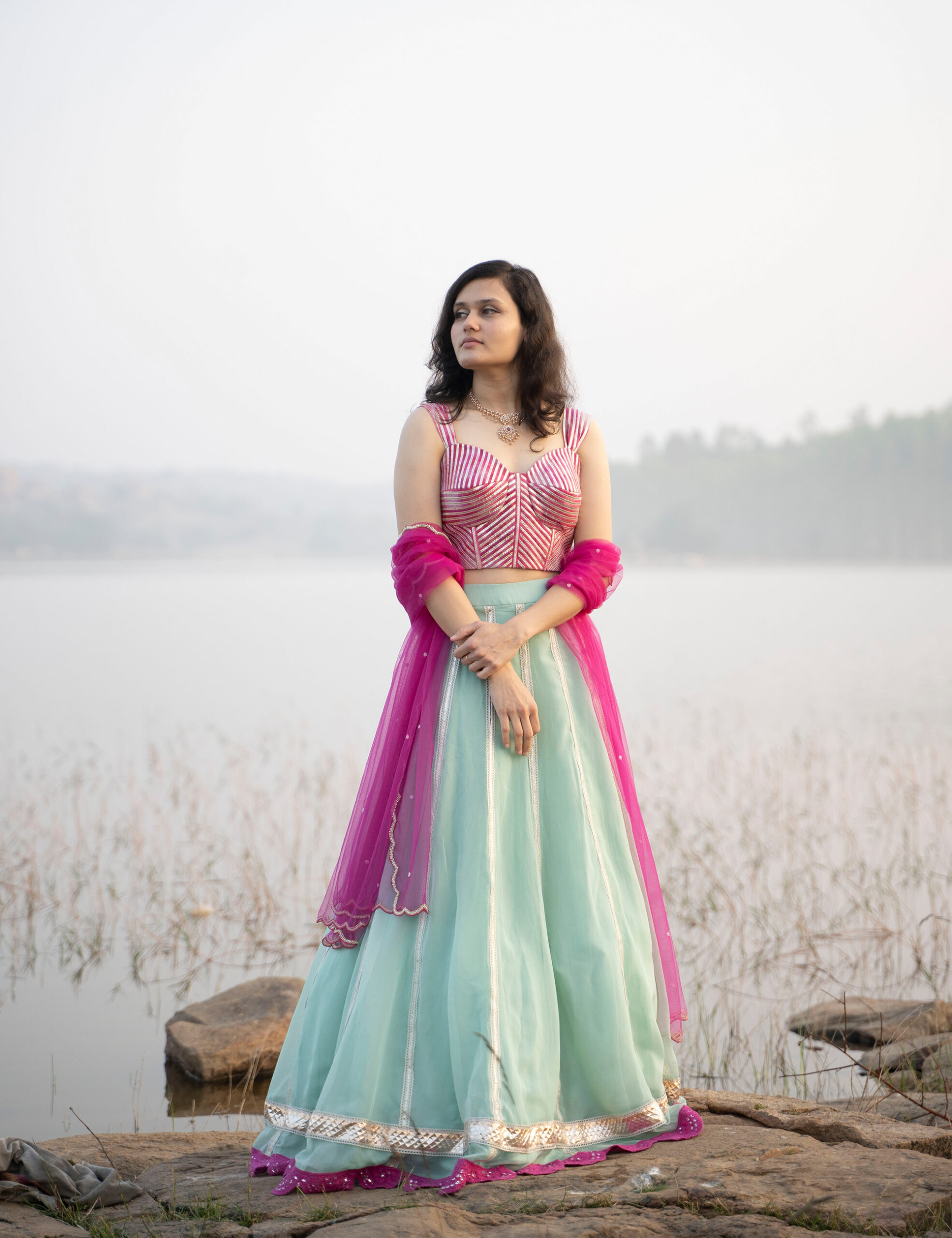 A refreshing mint lehenga featuring vibrant gota embroidery along the hem and intricate embroidered vines . Paired with a Rose pink geometrically embroidered panel blouse and a delicate dupatta adorned with scalloped edges.