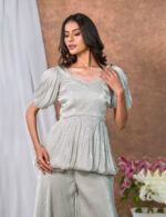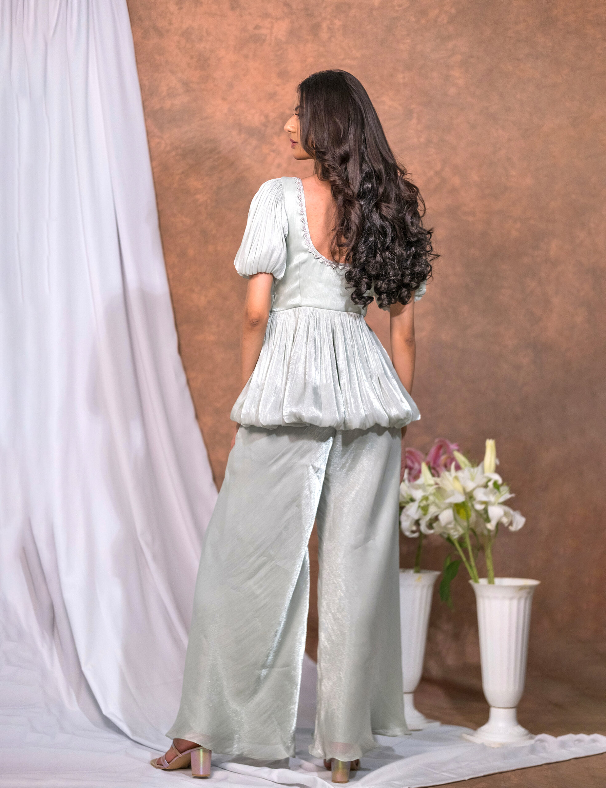 Make a statement with this fully subtle shinny mint peplum set, featuring our pleated Peplum top with a hand embroidered detailed work at the neckline and flared pallazo pants . It’s truly one of a kind!