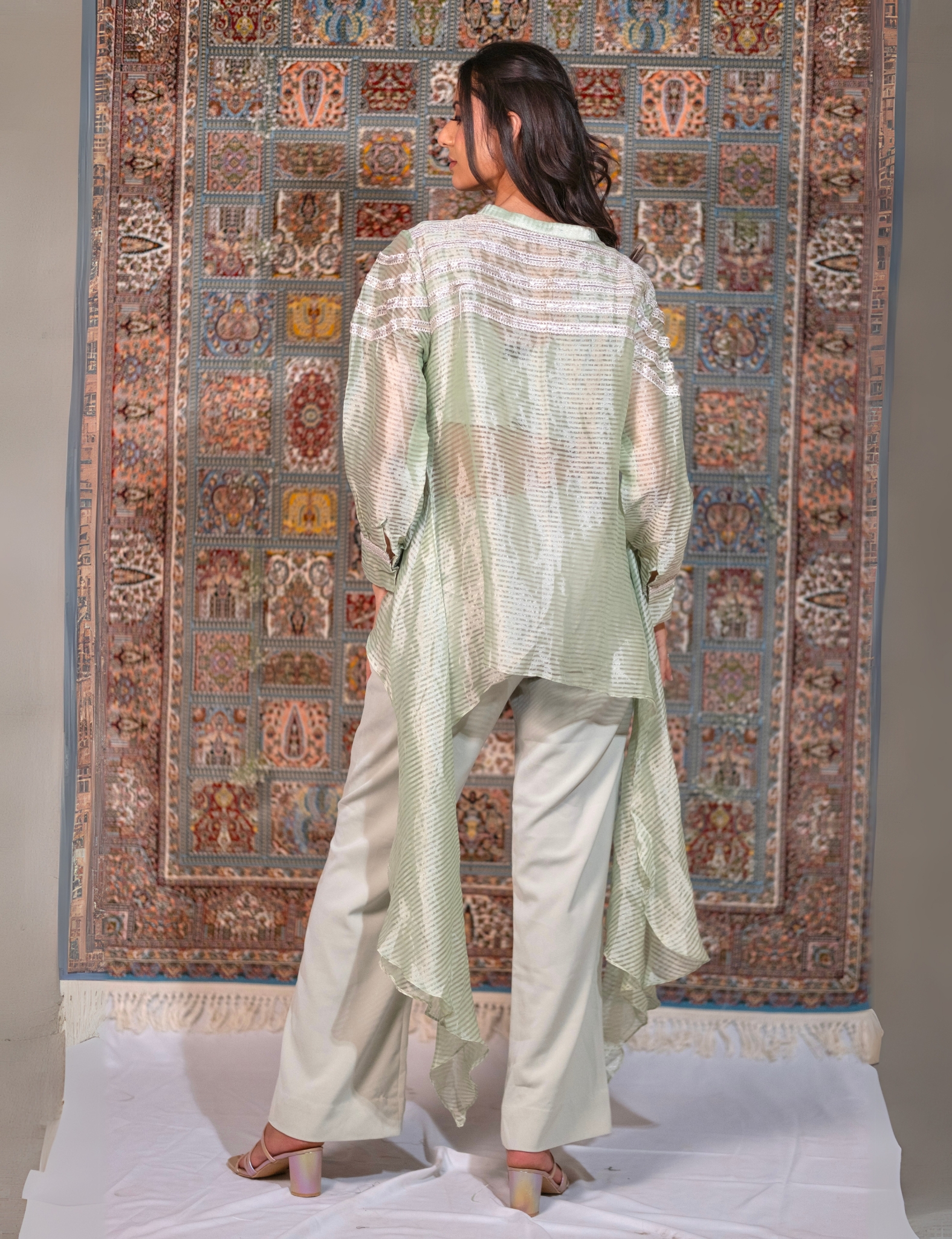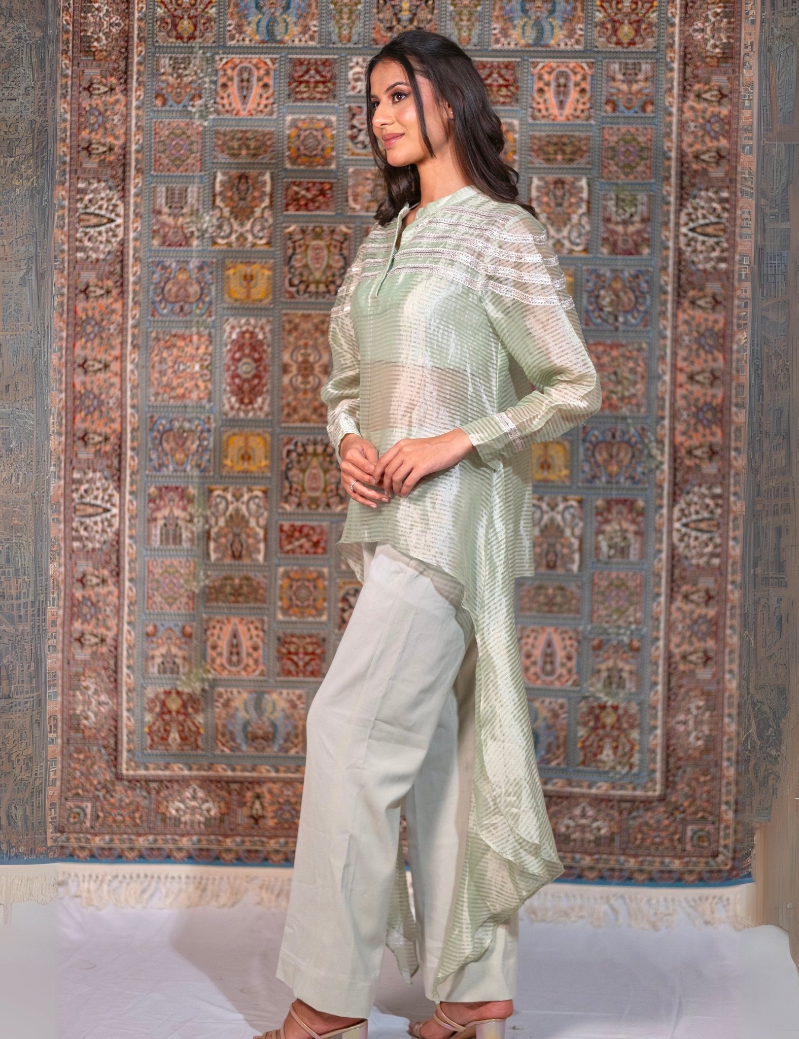 This Mint Chanderi co-ord set is the ultimate summer outfit with gota work and scalloped edges . Paired with flared pants and a crop top.