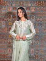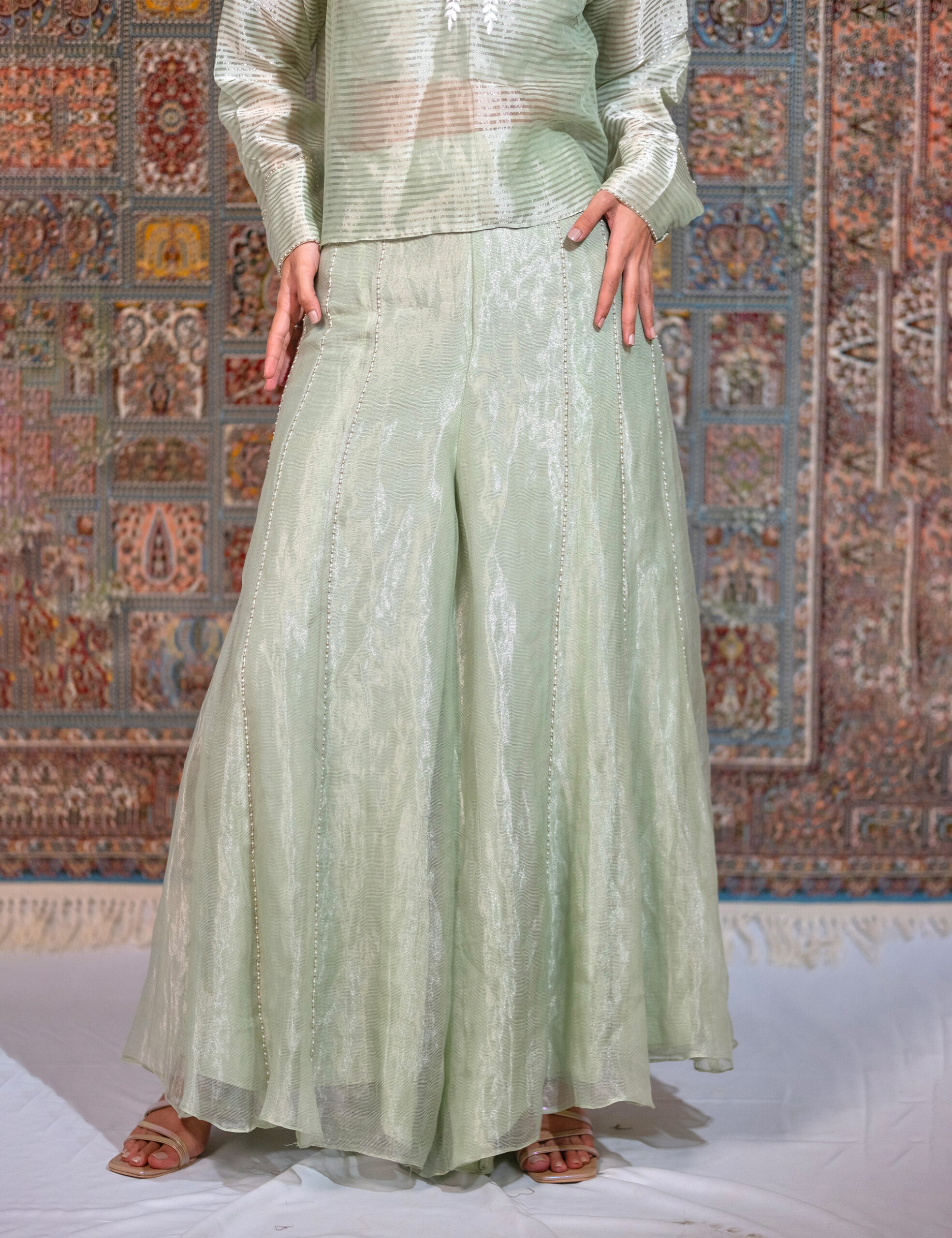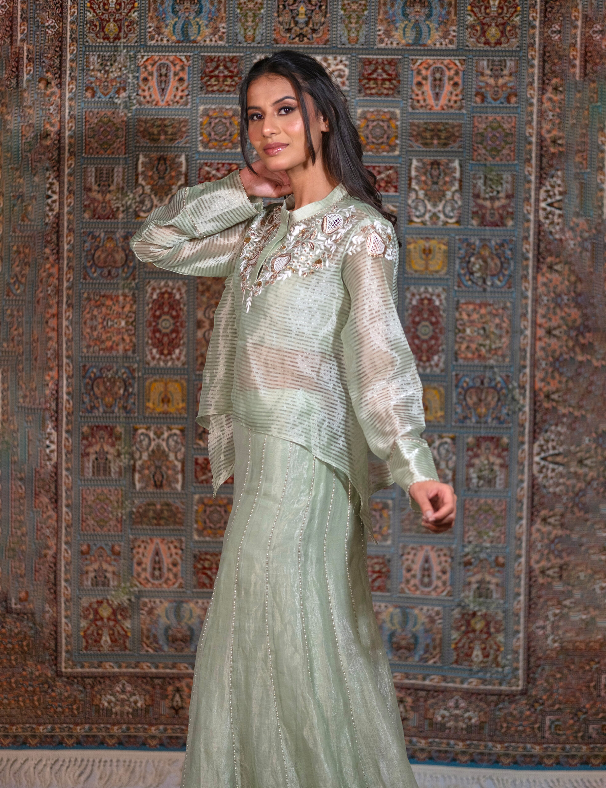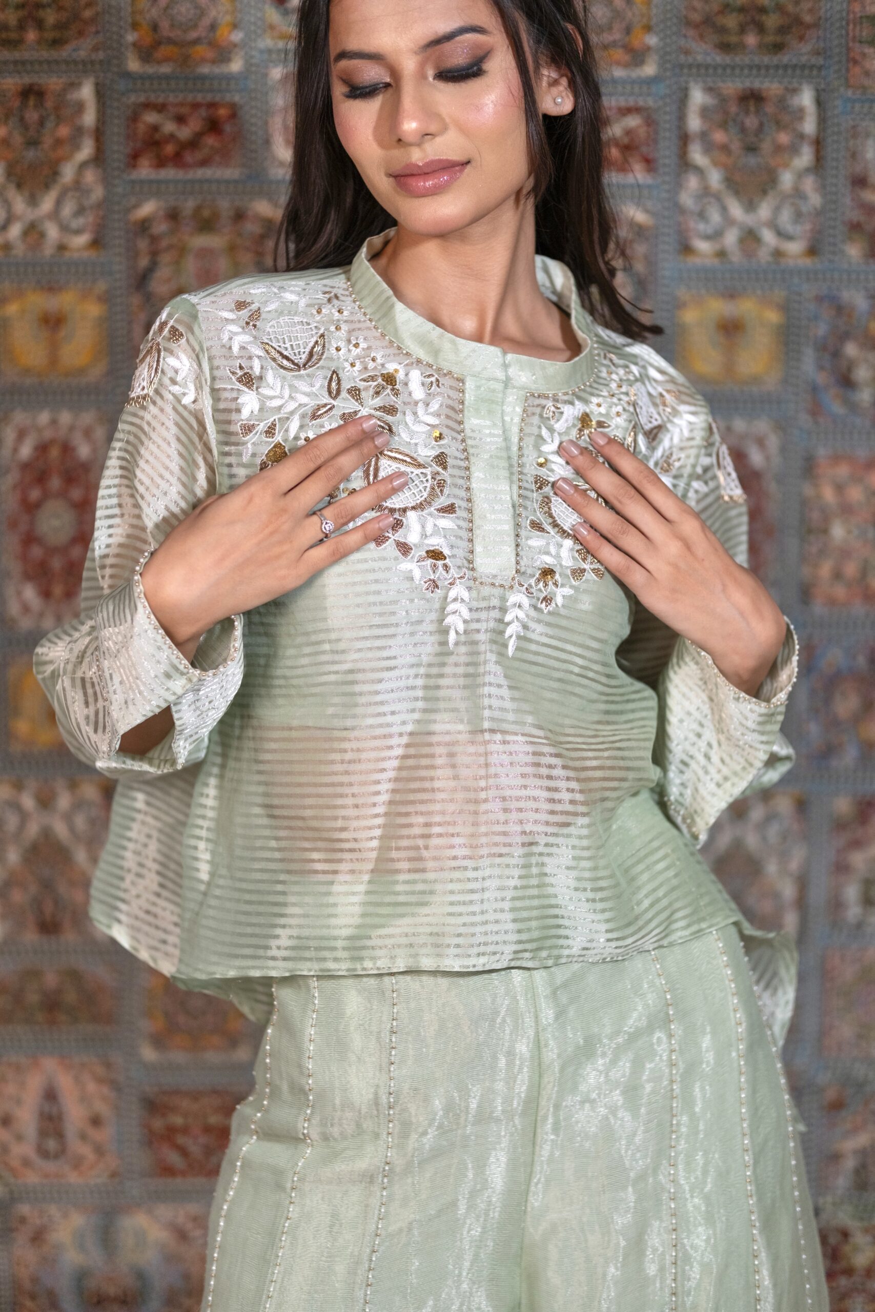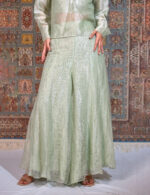 This Mint Chanderi co-ord set embroidered with delicate yet intricate patterns make it dreamy. Paired with panneled embroidered pants and a crop top.