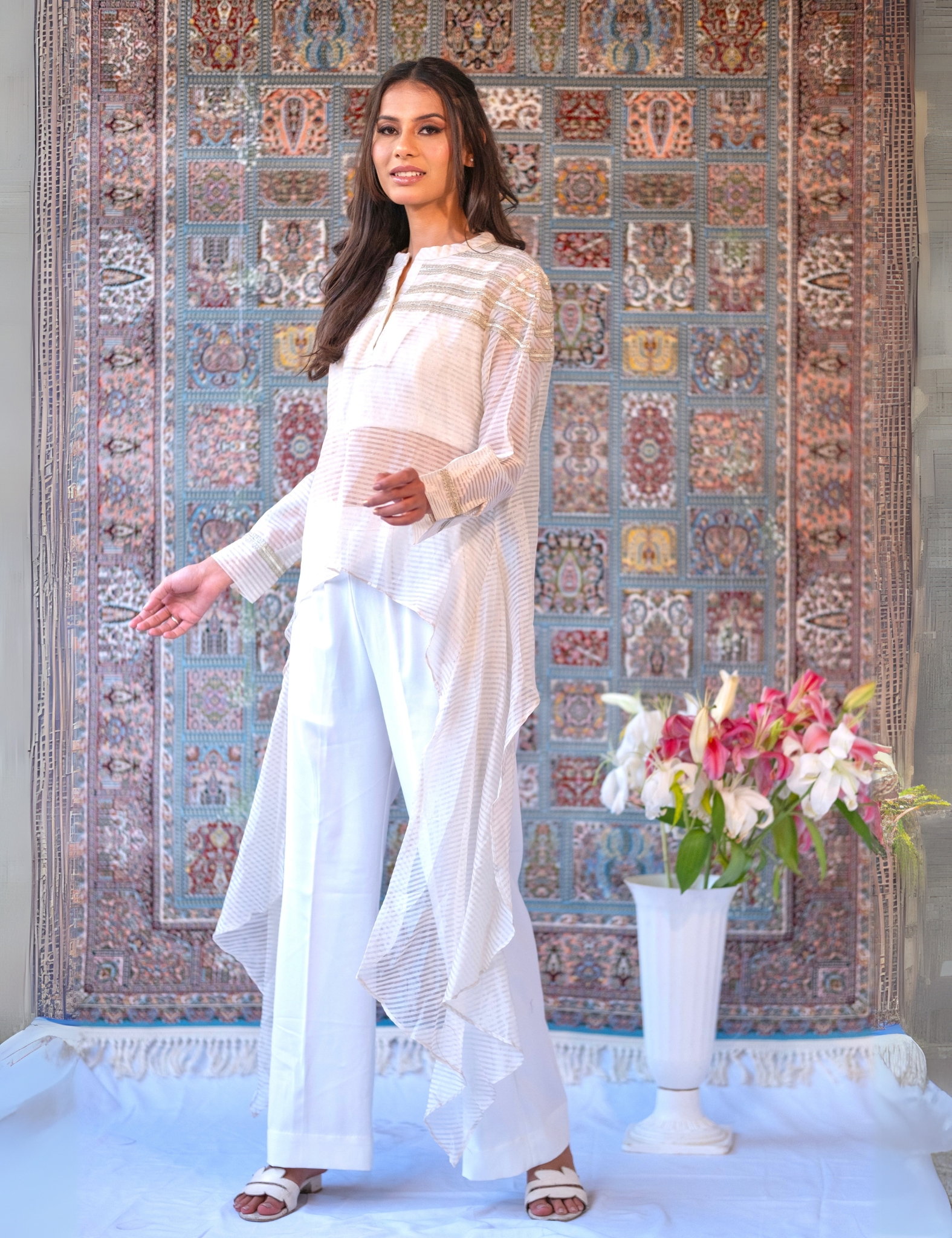 This off white Chanderi co-ord set is the ultimate summer outfit with gota work and scalloped edges . Paired with flared pants and a crop top.