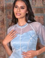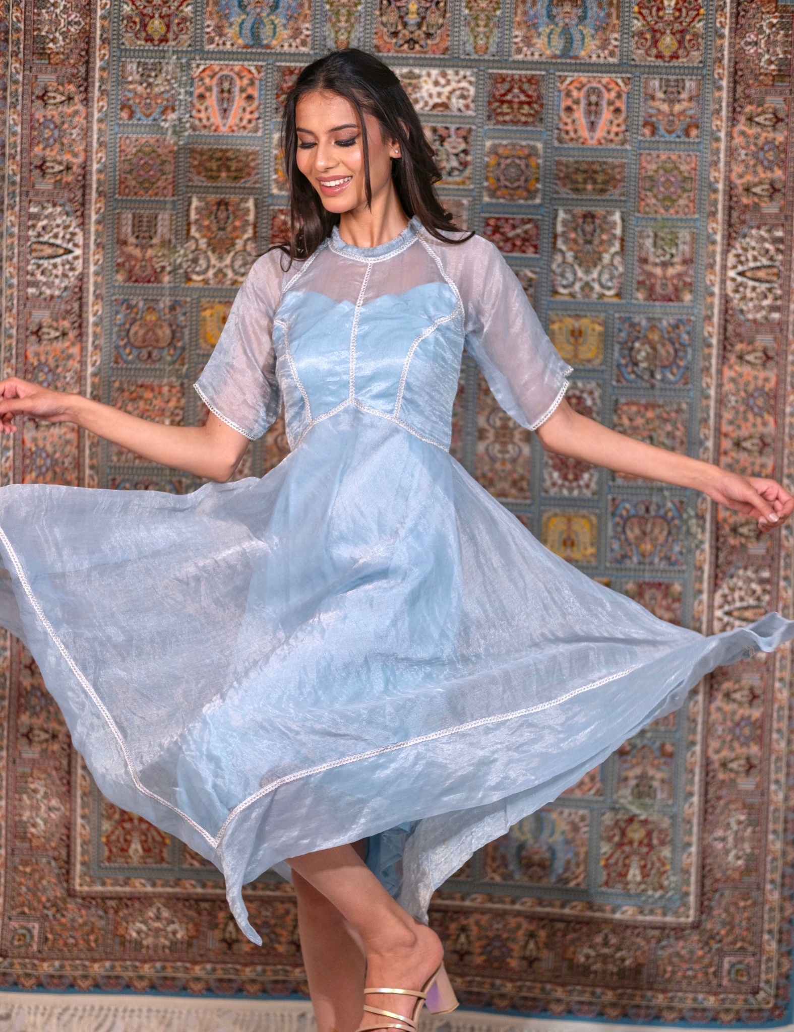 This blue Chanderi handkercheif dress with silver zari lining is paired with a scallop edging and pleated color. This would make a great addition to the posy wardrobe.