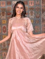 This peach Chanderi handkercheif dress with silver zari lining is paired with a scallop edging and pleated color. This would make a great addition to the posy wardrobe.