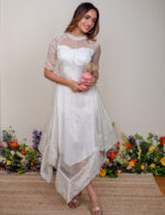 This off white Chanderi handkercheif dress with silver zari lining is paired with a scallop edging and pleated color. This would make a great addition to the posy wardrobe.
