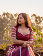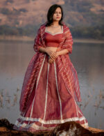 A perfect colors to feel the breezy summer sunset. A delicately embroidered lehenga set with got to embroidered vines and intricate border. Paired with an organza blouse with scalloped edges and intricate dupatta to pair with.