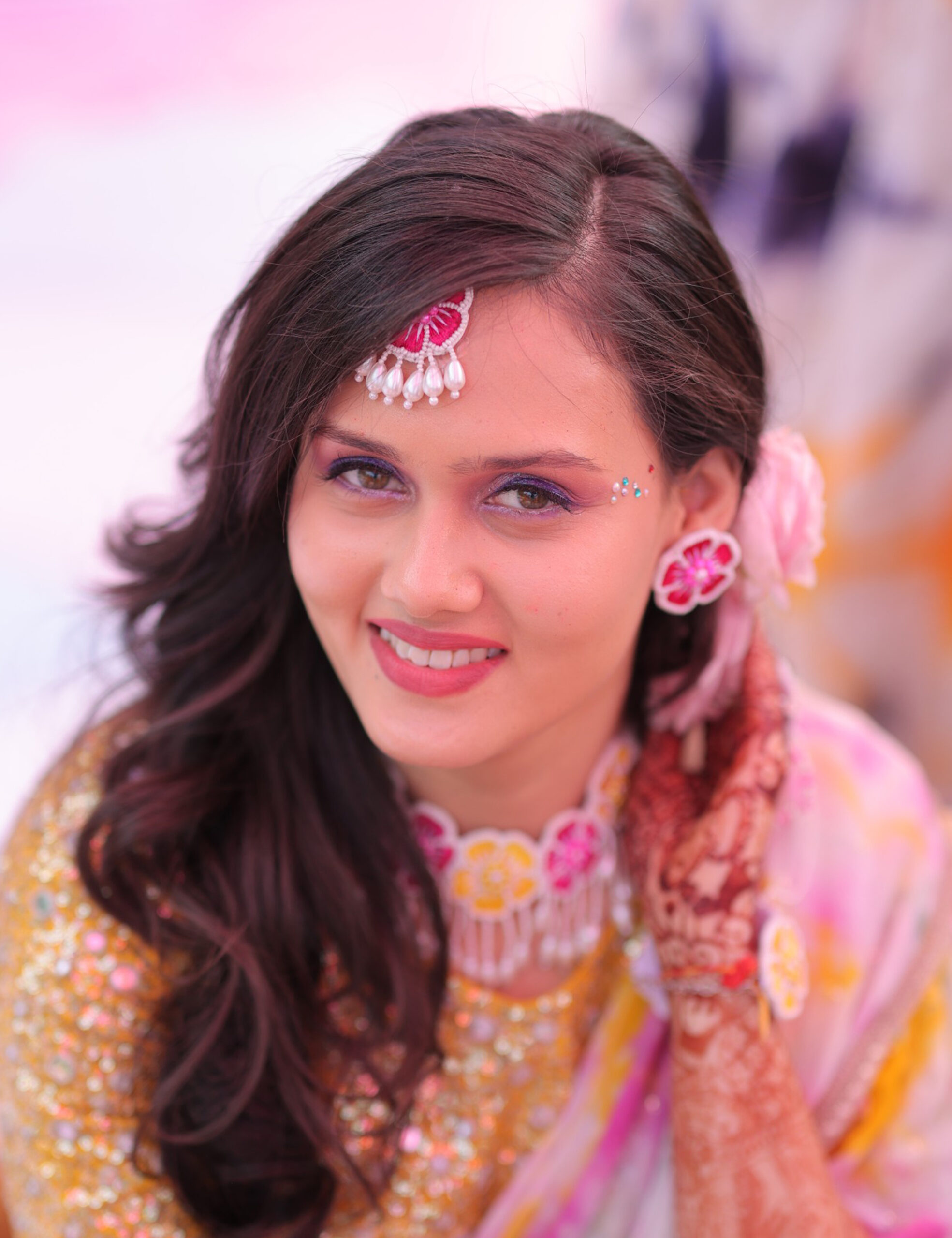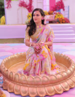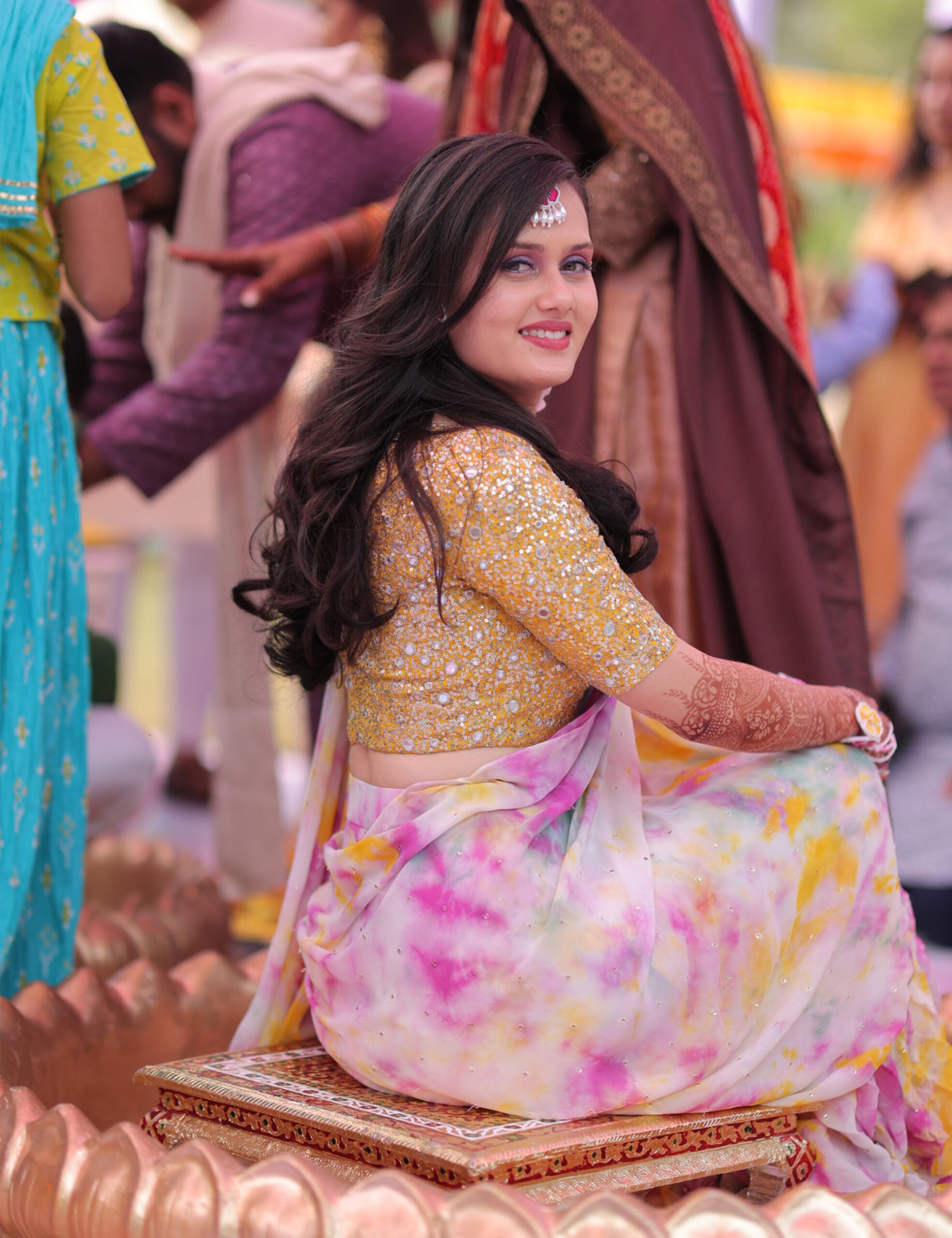 The fine tie and dye draped ruffle saree which is paired with embroidered mustard yellow blouse.
