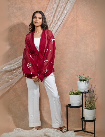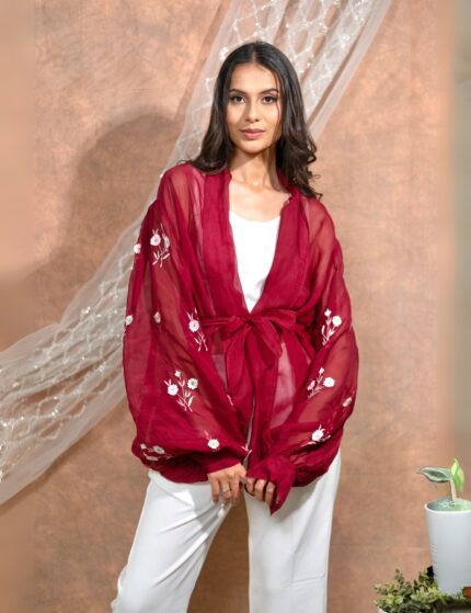 Bloomed maroon jacket with dress set